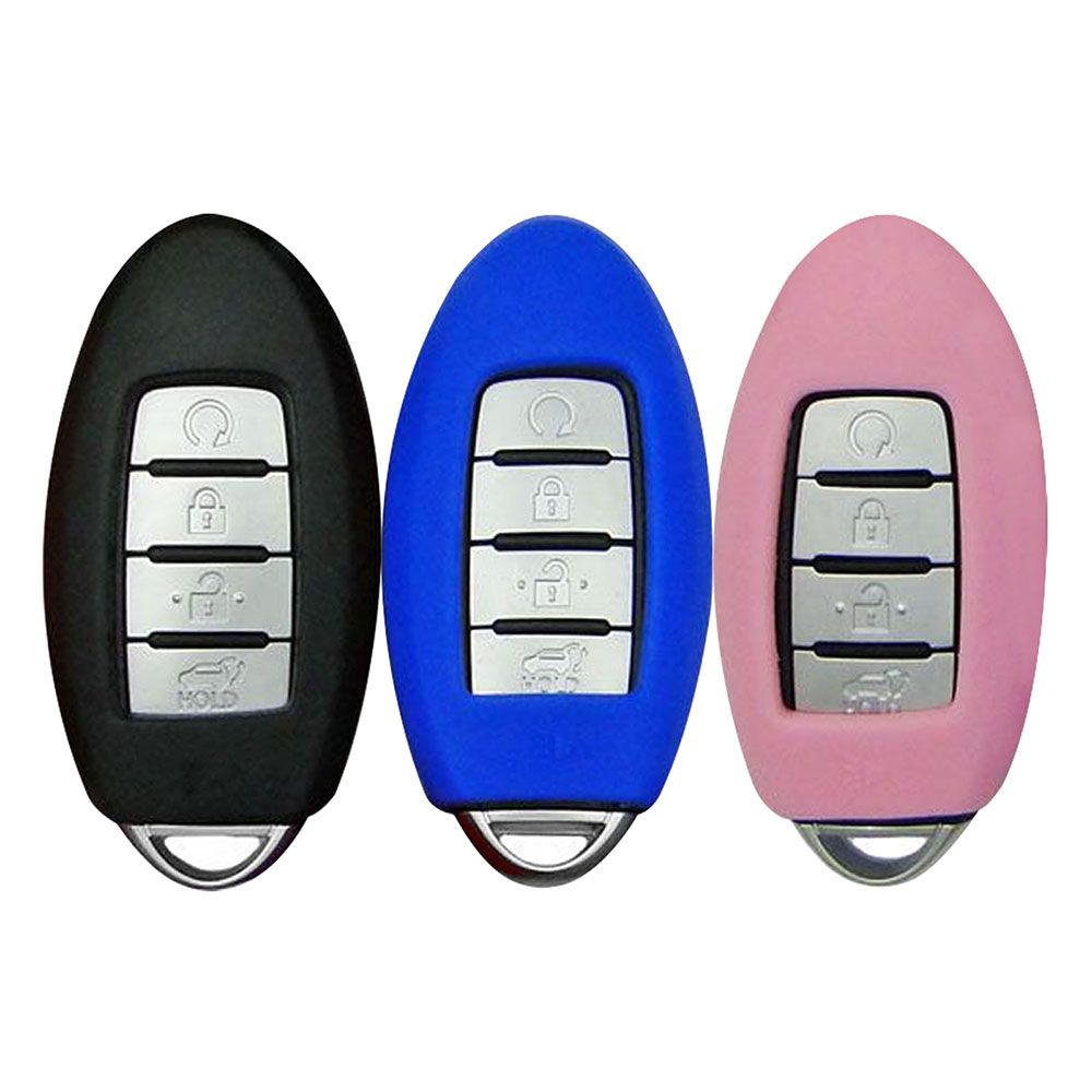 Nissan, Infiniti Smart Remote rubber cover - 5 buttons. The very bottom button- panic button is covered by the rubber. Silicone remote cover is a great way to protect and personalize your keyless entry remote. Those remotes are very expensive to replace. Protect your remote against damage. These covers slip over your remote. Just take off your key ring, slip the cover over your remote and put the key ring back. This is a remote cover only, remote is not included. This product offers a simple solution to protect, distinguish, and prevent broken & scratched up car & truck remotes. Added features of this product include: damage prevention, replacement costs, accidental engagement of control functions, ability to reattach a broken remote, and personalization through a variety of colors.